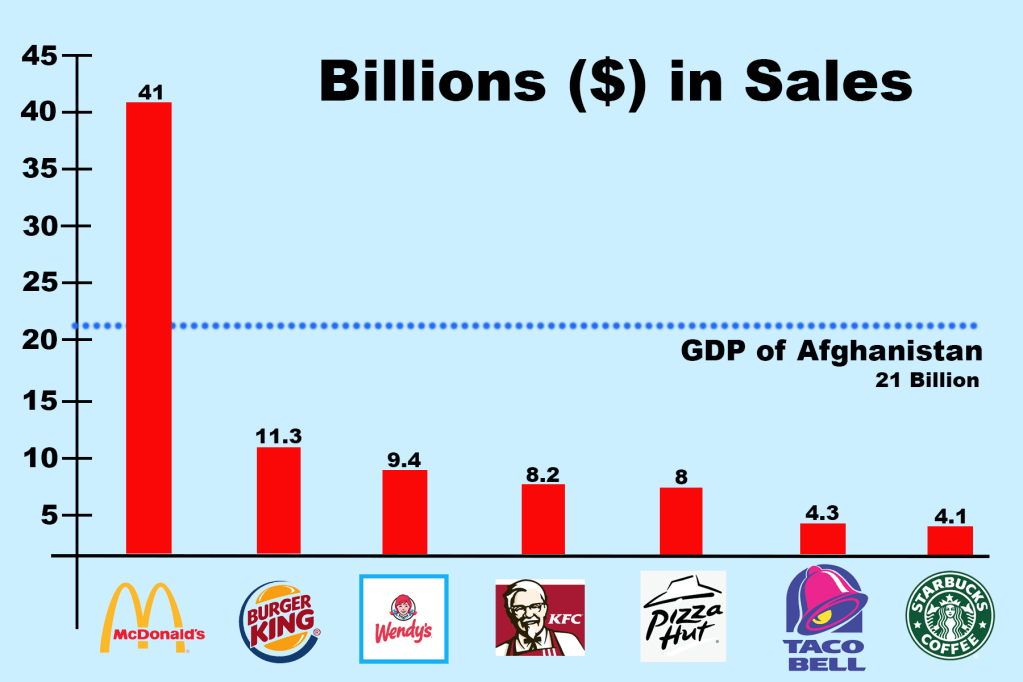 I chose a before image that, while having some visual appeal, does not adequately convey the statistics. For instance, it is hard to make comparisons from this graph due to the use of the logos as the bars (since they are different widths). In the before image Wendy’s numerical statistic is twice as many sales as Starbucks, but the logo looks 4 times as large, which can trick the eye into believing the different is more significant. Also, McDonalds is 4 times as many sales as Burger King, but its logo appears to take up 6+ times of space. All of these fast food sales are laid on top of the GDP of Afghanistan, again with an image that can confuse the eye.