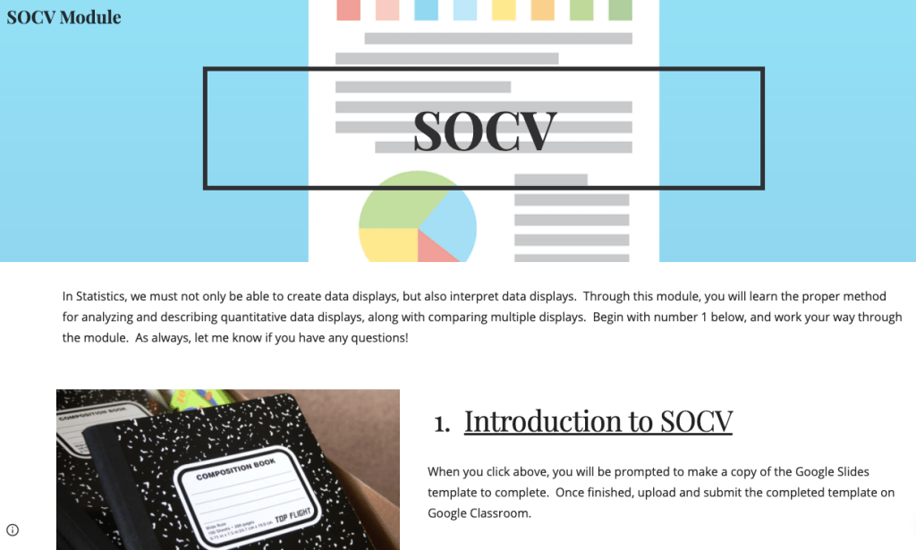 This course was a continuation of Design and Development 1, where the goal was to create a learning module for use in my classroom that consisted of self-authored learning objects and assessment. The audience for my module is high school seniors taking Honors Statistics (generally as a precursor to AP Statistics). Following the multimedia principles outlined in Clark and Meyer’s e-Learning and the Science of Instruction, I created various instructional videos, practice with automated explanatory feedback, worked examples videos, and a final assessment. I decided to house my module using a Google Site. Please visit the Google Site to view my work: