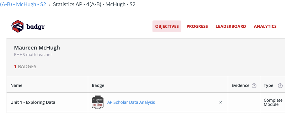 Evidence – The badge will be issued via our LMS, thus all evidence will be online. Within the modules they must complete, students will indicate they watched the videos (“mark as done”) before the next step in the module unlocks. The next step will require them to submit a free-response AP exam question. Once they have submitted, the next part will open, which is a multiple choice quiz. Students must make a minimum of a 50% on the quiz (which translates to a 3 on the AP exam) before the module is considered complete.