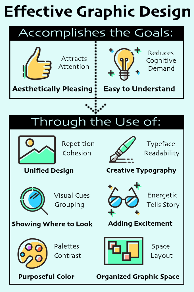 I created the above concept map to both describe and utilize several components of effective graphic design. First I focused on the main goals, which is creating aesthetically pleasing images that are at the same time easy to understand and get the point across. I added an arrow to direct the eye to the next part, ways of accomplishing those goals. This was organized into 6 main categories with some key words thrown in. I used some PNG images from a pre-made collection in an effort to add interest and promote unity between the different topics. I then used a light colored background in the same color palette as the images, again to promote a unified design. Overall I think this concept map is informative and attractive without getting too cluttered or cognitively overwhelming.