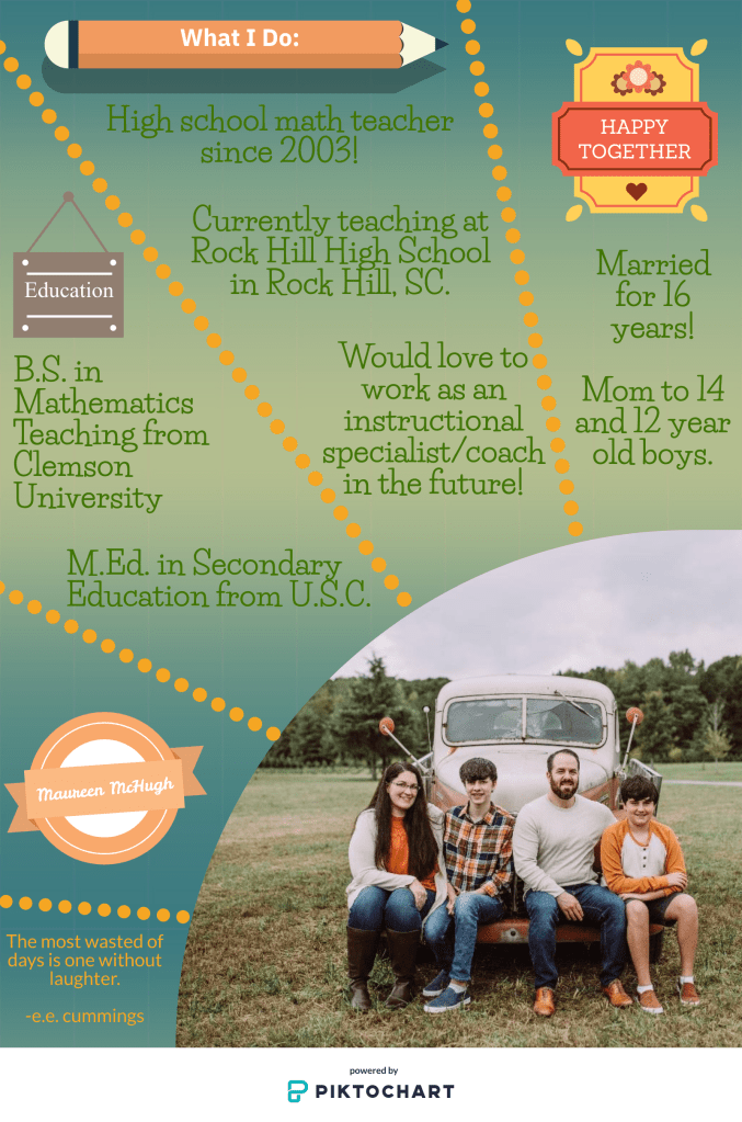 The infographic below is my first attempt at graphic design. I used piktograph.com to create the infographic. To introduce myself, I included information about my education, work experiences, and personal life. This information was superimposed into a template I designed with various colors and graphics.